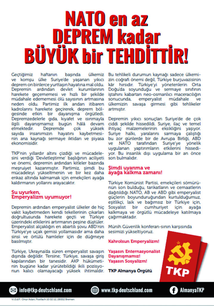 Woche erschütterte, forderte Zehntausende von Menschenleben. Die Unfähigkeit der staatlichen Institutionen, nach dem Erdbeben schnell zu mobilisieren und zu intervenieren, ließ die Zahl der Todesopfer steigen. Unsere Partei hat vom ersten Moment ana ihre Kader mobilisiert und eine intensive Solidarität in der Erdbebenregion organisiert. Unsere Solidaritätsaktion mit den Erdbebenopfern in Form von
