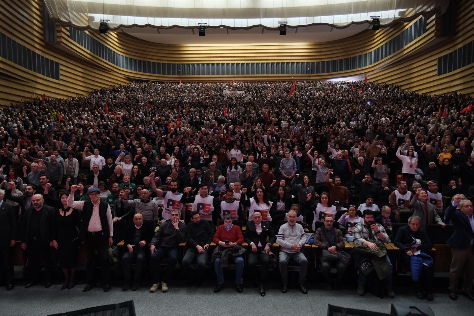 An der Massenkundgebung der TKP nahmen die Textilarbeiter von Digel teil, die seit über einem Jahr Widerstand leisten, die Textilarbeiter von Elsa, die sich nach ihrer Entlassung zur Wehr setzten und ihren Arbeitgeber zum Einlenken zwangen, die Leiharbeiter der Stadtverwaltung von Izmir, die durch ihren Kampf ihre Rechte durchgesetzt haben, sowie die Lagerarbeiter von Ankara Algida, die durch ihren Widerstand ihre Stimme erhoben haben.