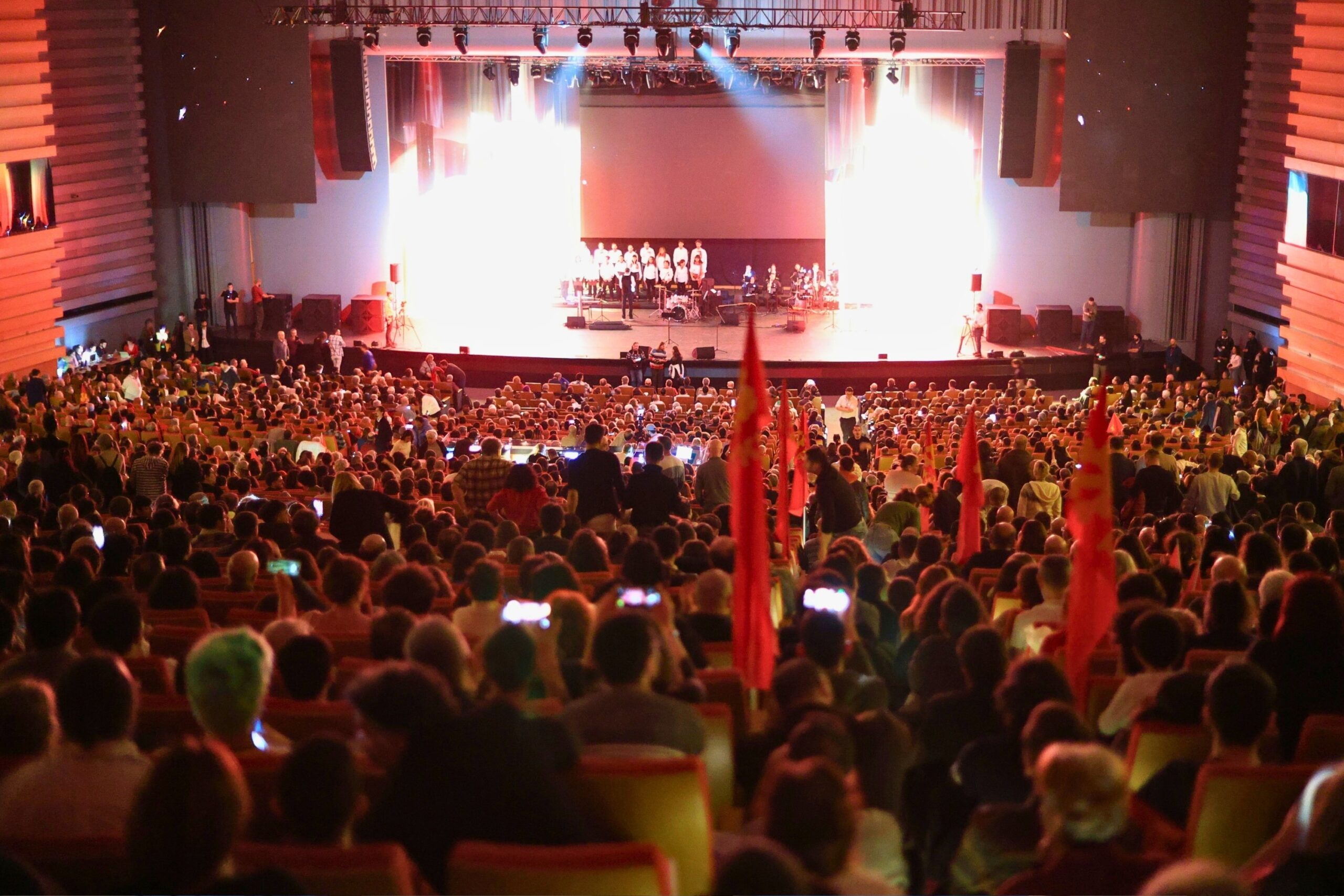 Die unter dem Motto „Wie Schiffe, die sich den Wellen stellen; die TKP fordert heraus!“ stehende Kundgebung begann im Ankara Congresium mit dem Auftritt des TKP-Chors und dem gemeinsamen Singen der Internationale durch das Publikum.