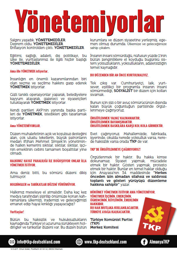 DIE REGIERUNG WILL REGIEREN, IST ABER NICHT FÄHIG DAZU. ZU REGIEREN IST DAS RECHT DES ARBEITERS, DES WERKTÄTIGEN, DES STUDENTEN, DES BAUERN, DES RENTNERS. DIESES RECHT WIRD DEFINITIV AUSGEÜBT WERDEN. DIE TÜRKEI WIRD SICH ERHEBEN.