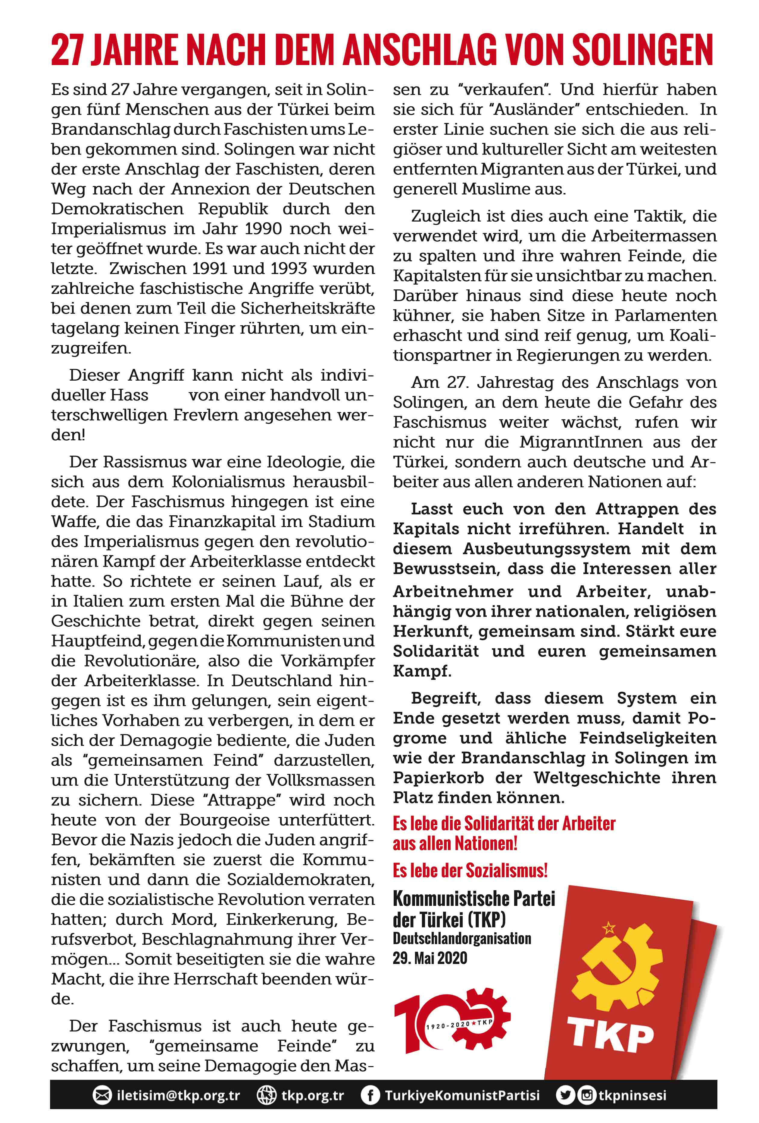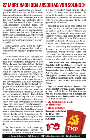 Am 27. Jahrestag des Anschlags von Solingen, an dem heute die Gefahr des Faschismus weiter wächst, rufen wir nicht nur die MigrantInnen aus der Türkei, sondern auch deutsche und ArbeiterInnen aus allen anderen Nationen auf: