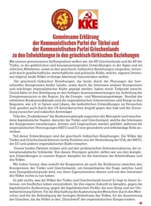 Mit unserer gemeinsamen Stellungnahme wollen wir, die KP Griechenlands und die KP der Türkei, in die gefährlichen und besorgniserregenden Entwicklungen in der Ägäis und im östlichen Mittelmeer, sowie in den griechisch-türkischen Beziehungen eingreifen, verurs- acht durch gesellschaftliche, wirtschaftliche und politische Kräfte, welche, eigenen Interes- sen folgend, beide Völker in blutige Abenteuer hineintreiben wollen.